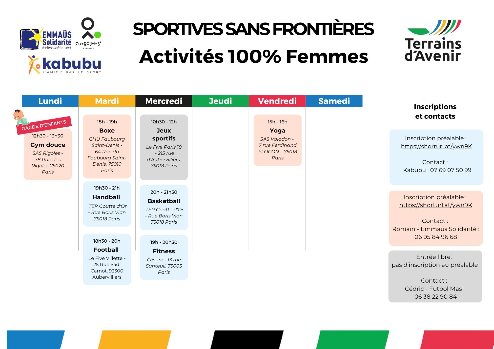 Terrains d’Avenir est un programme destiné aux populations exilées en Ile-de-France. Mis en oeuvre par un consortium de six partenaires, Terrains d’Avenir est soutenu par Olympic Refuge Foundation et le ministère des Sports et des Jeux Olympiques et Paralympiques.